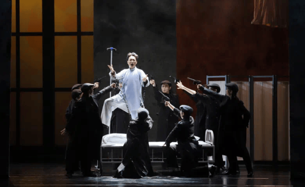 演出一开场,舞美、灯光、音效和演员状态,就共同营造出一种紧张刺激、惊心动魄的谍战剧氛围,把观众带入到那个动荡不安、危机四伏的时代,跟随主人公李得钊的命运一起跌宕沉浮。舞台上几块巨大的可移性景片快速切换移动,光线明暗交错中,身份不同的各种人物在其中穿梭、躲藏、追捕,营造出血雨腥风的压迫感和扣人心弦的悬念感。