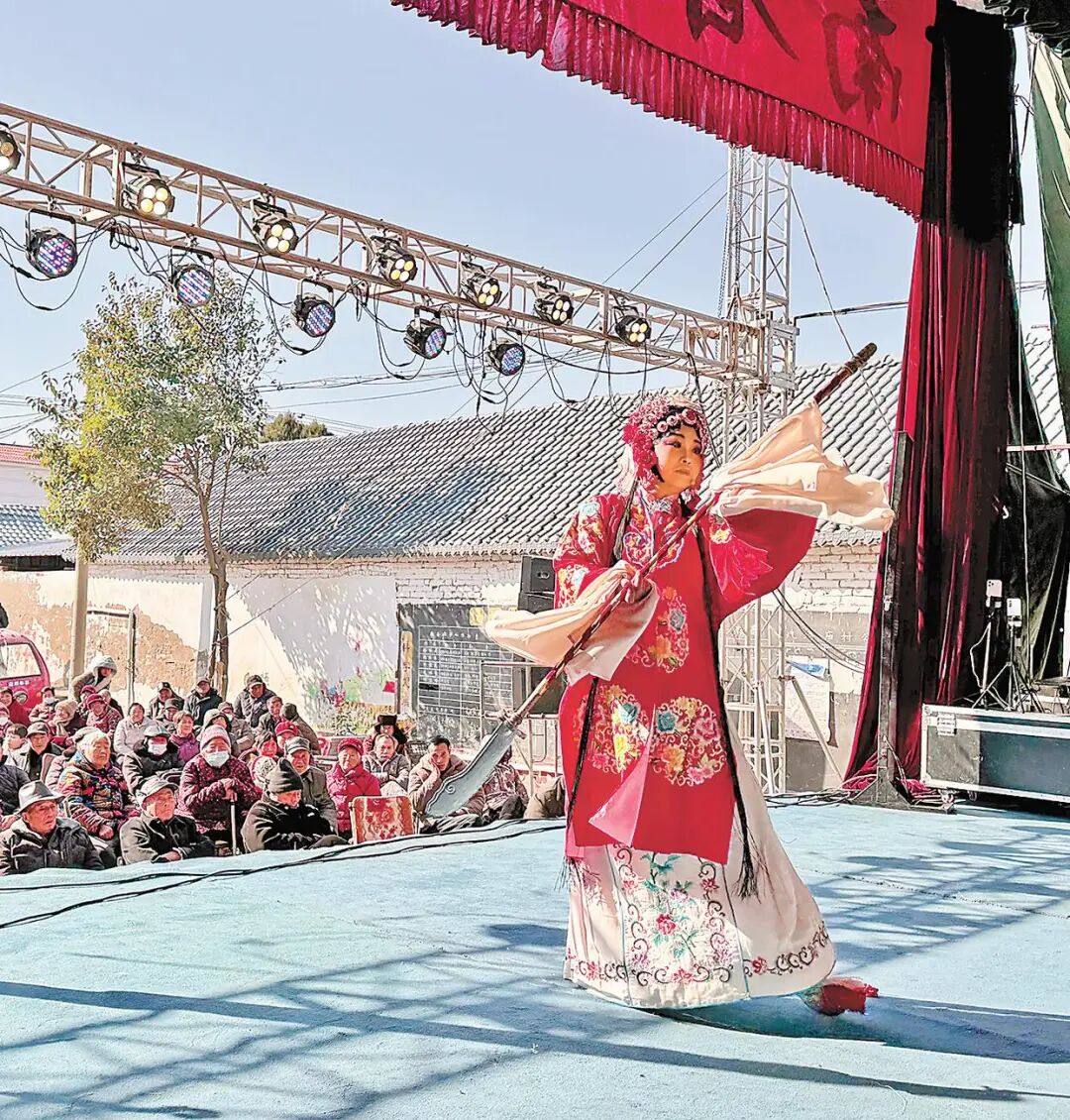 台下一阵鞭炮响,台上一通锣鼓声。正月初八上午9时,戏台帷幕缓缓拉开。河南许昌鄢陵县豫剧团演员们依次入场,唱、念、做、打样样娴熟,将豫剧《五世请缨》呈现在村民面前。